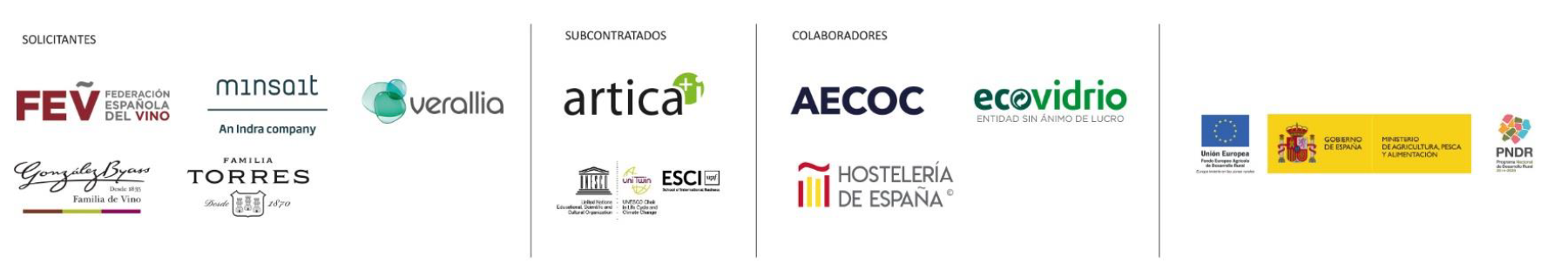El proyecto estará desarrollado por un Grupo Operativo de carácter supraautonómico (Madrid, Andalucía y Cataluña) liderado por la Federación Española del Vino (FEV) y con la participación de otras 8 entidades que representan a distintos eslabones de la cadena de valor del vino y del ciclo de vida del producto: Verallia Spain, González Byass, Familia Torres, Artica Ingeniería e Innovación (artica+i), la Cátedra UNESCO de Ciclo de Vida y Cambio Climático ESCI-UPF, y, como socios colaboradores, la Asociación de Fabricantes y Distribuidores (AECOC), Ecovidrio y Hostelería de España.